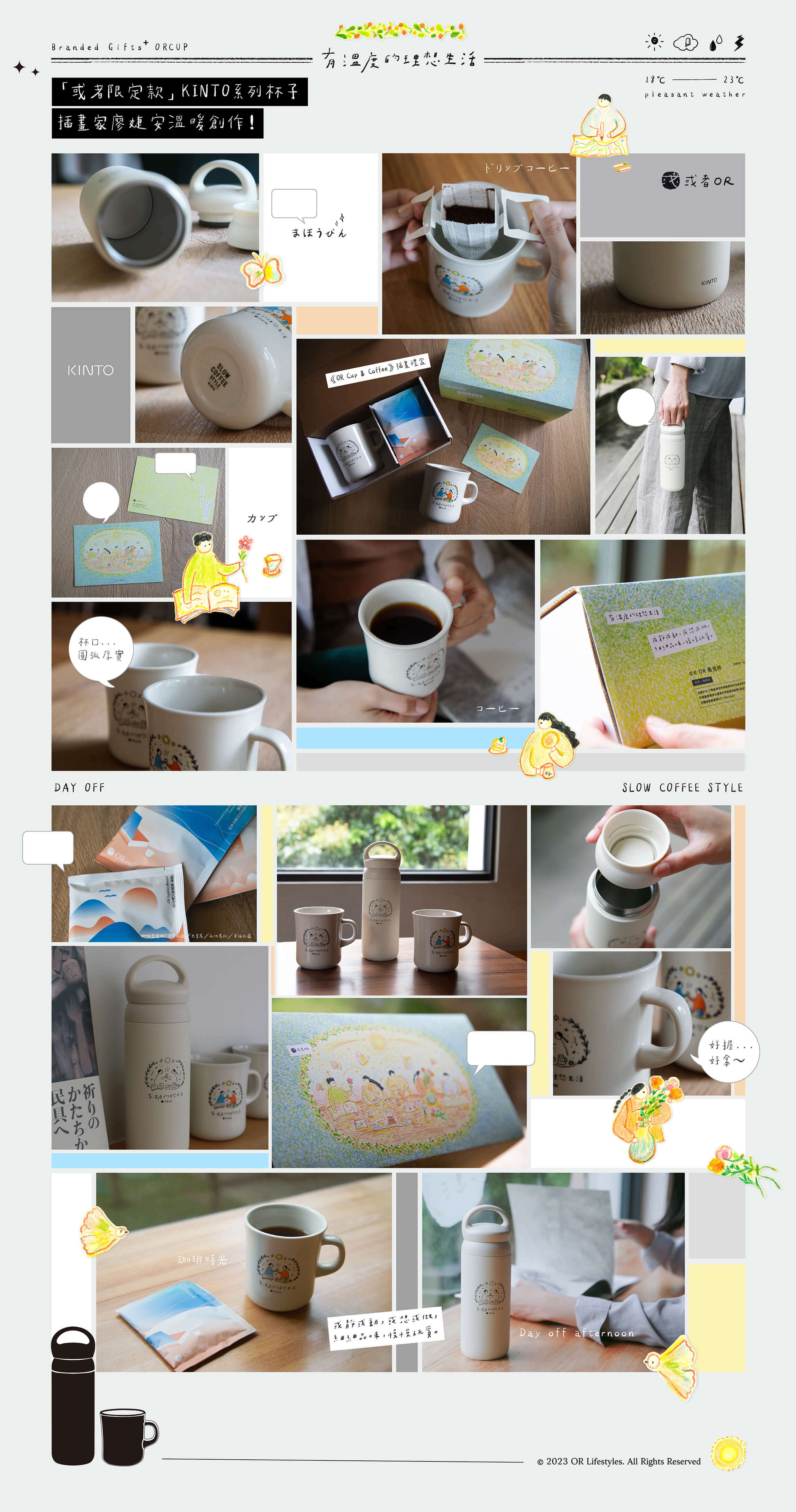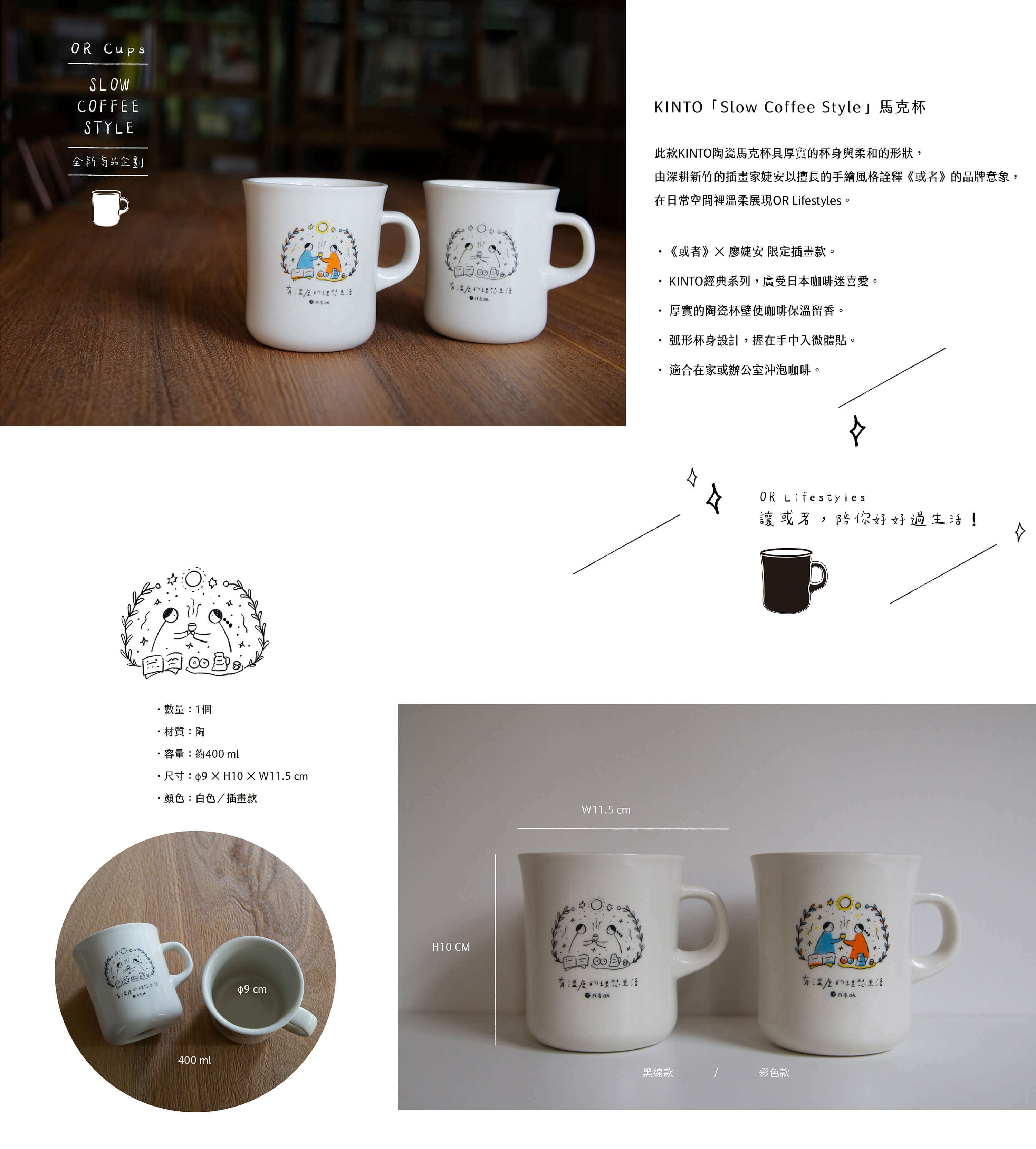 KINTO陶瓷馬克杯具厚實的杯身與柔和的形狀,由深耕新竹的插畫家婕安以擅長的手繪風格詮釋《或者》的品牌意象,在日常空間裡溫柔展現OR Lifestyles。