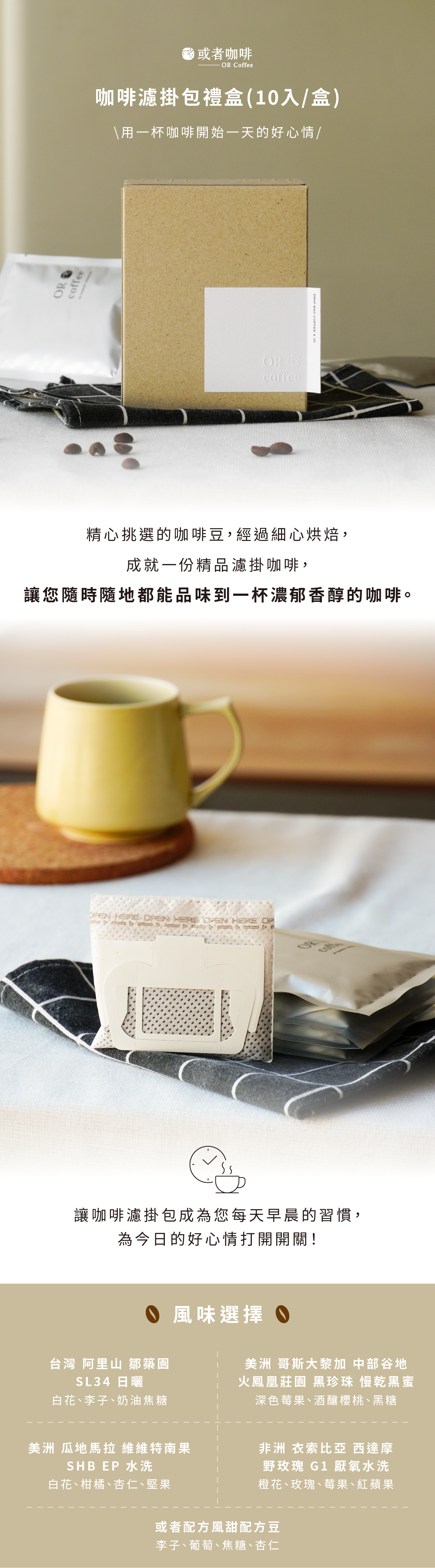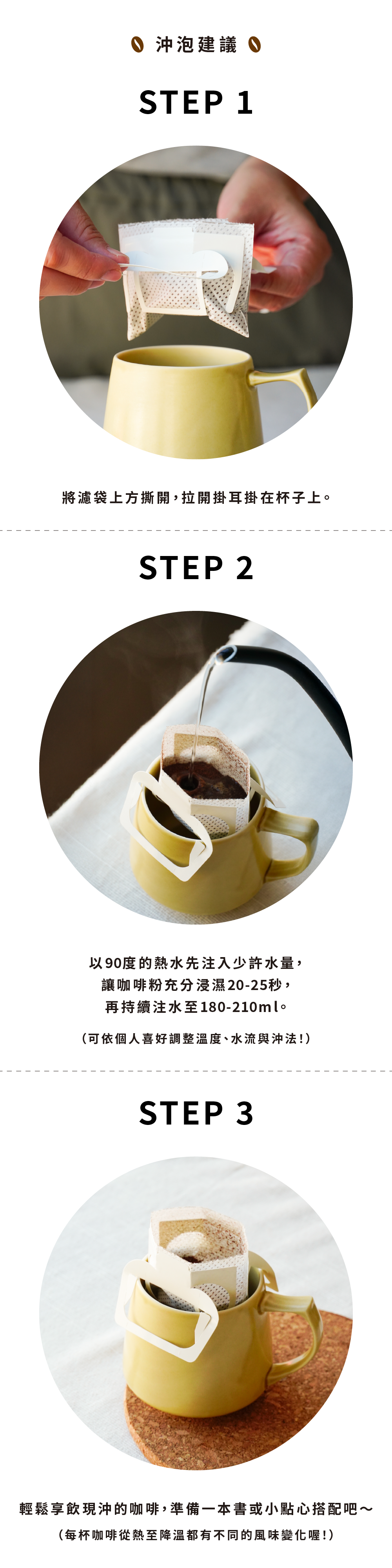 精選烘焙咖啡豆製成濾掛包,沖泡方式簡單,稍等片刻就能享受濃郁香氣。讓咖啡成為你每天的日常小儀式,在忙碌裡留下一點專屬的放鬆時光。