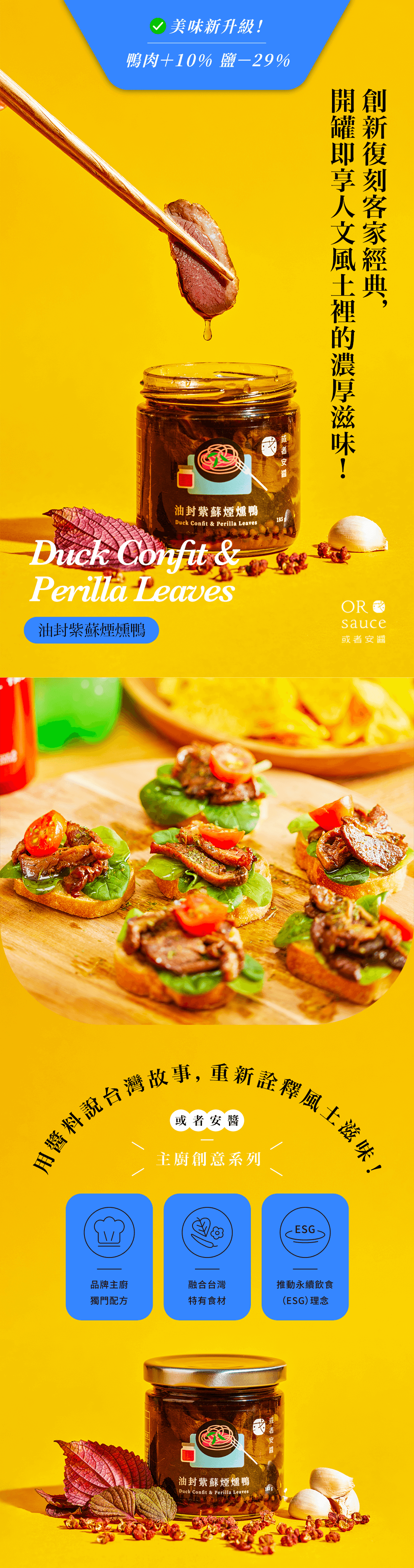 採用法式油封手法將「人道飼育認證」鴨肉與客家紅紫蘇的裊裊燻香封存進油脂中,一點一滴都貴的台灣味。