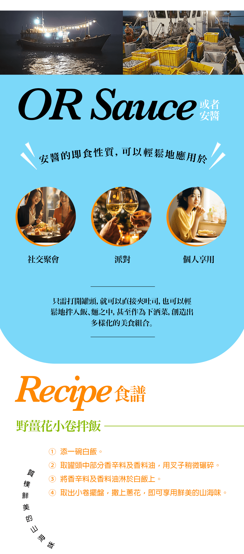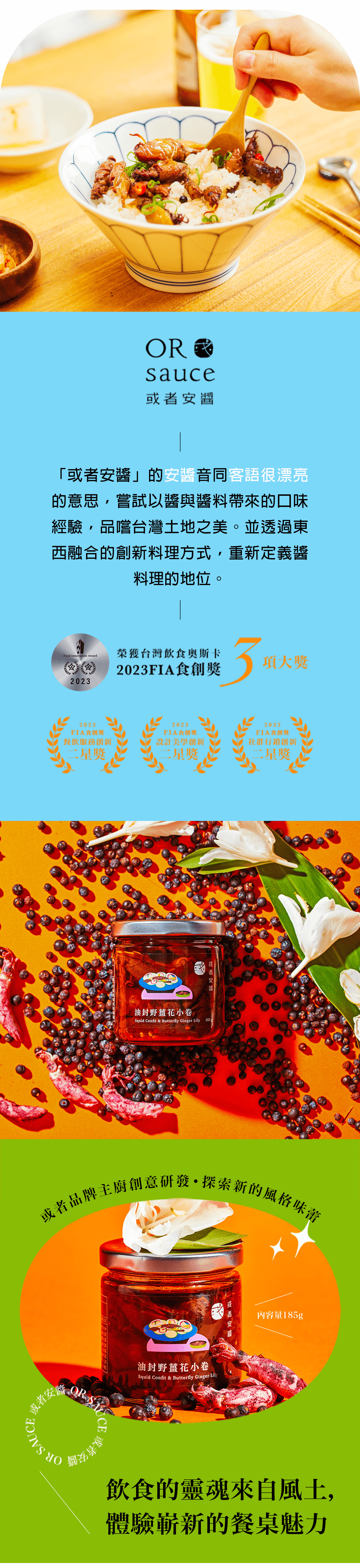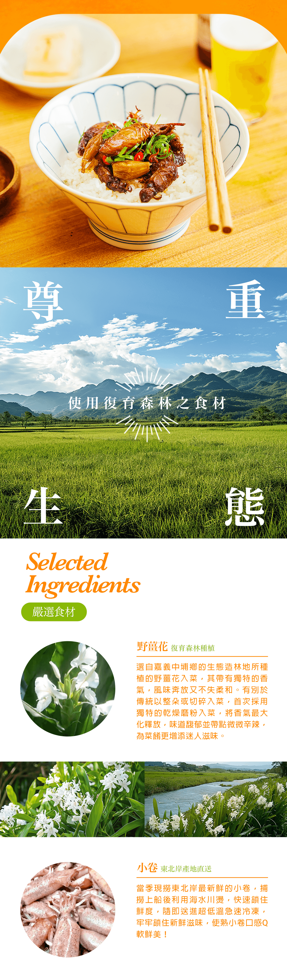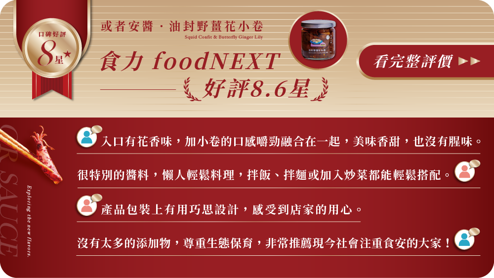 選用嘉義中埔鄉「復育森林」所種植的野薑花,搭配正值洄遊至東北岸的新鮮小卷,是一款別出心裁、獨具特色的即食醬品!