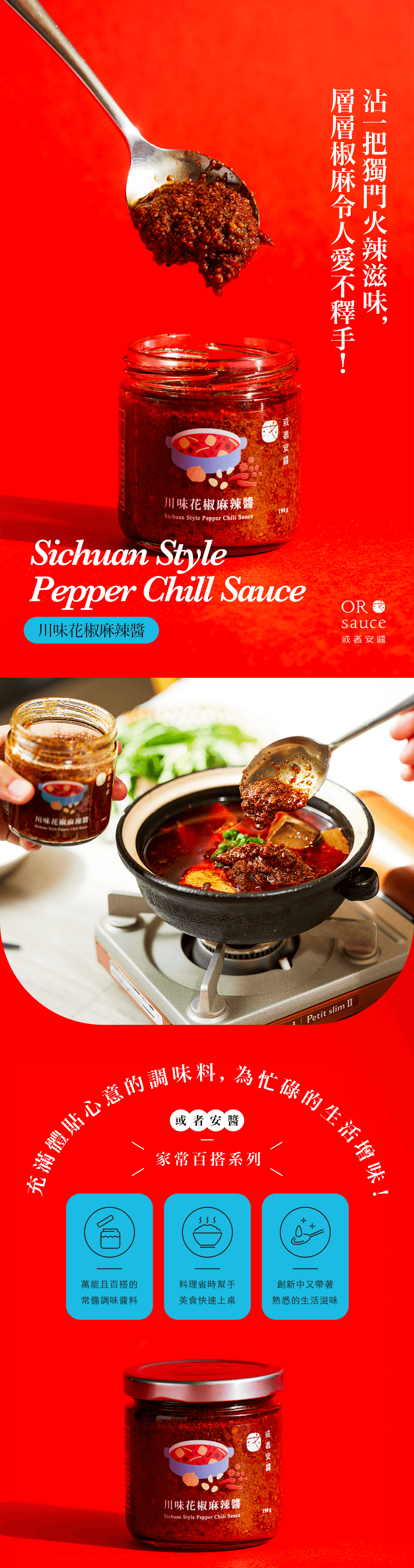 嚴選四川頂級大紅袍花椒配數種獨門香料,使香氣與辣度層次再提升,辣味麻而不燥,是涼拌、沾醬、鍋底的料理首選!