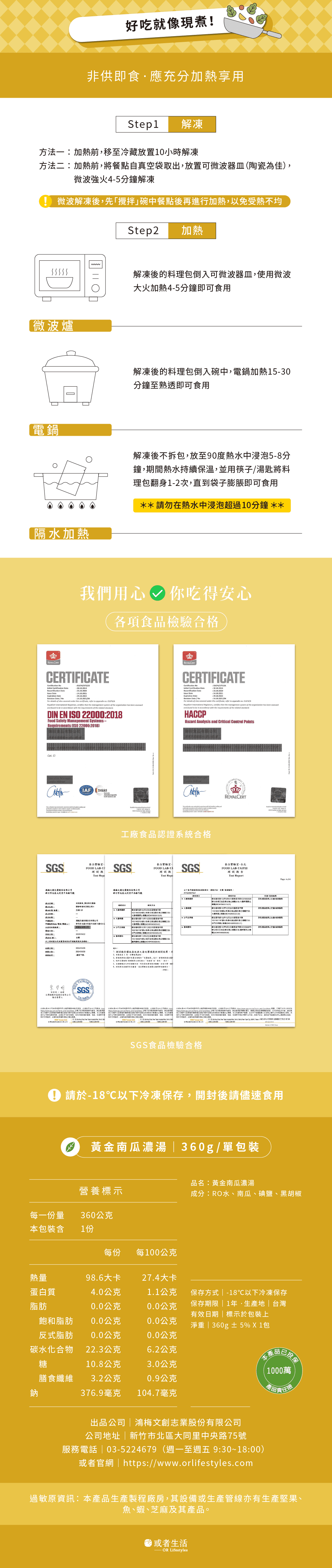 秉持「天然」、「健康」原則,只選用單一食材-南瓜,不另外添加鮮奶油,使濃湯保留南瓜最純粹的味道。南瓜去皮、去籽後蒸烤調理,減少了顆粒感且更加順口!