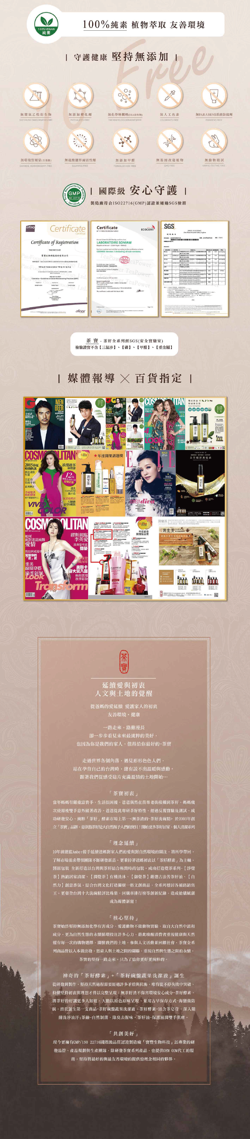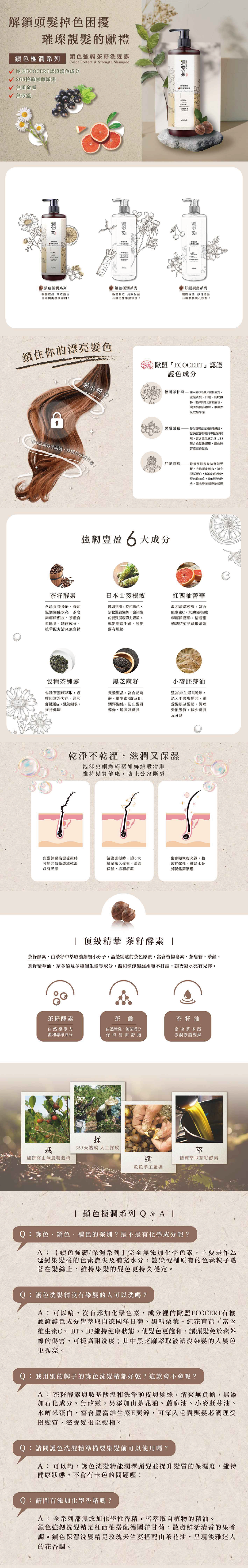 結合茶籽、紅西柚、包種茶、黑芝麻等天然成分,修護髮質,增強韌性與光澤,富含維生素B群與E,改善乾燥與斷裂,維持髮色與健康。