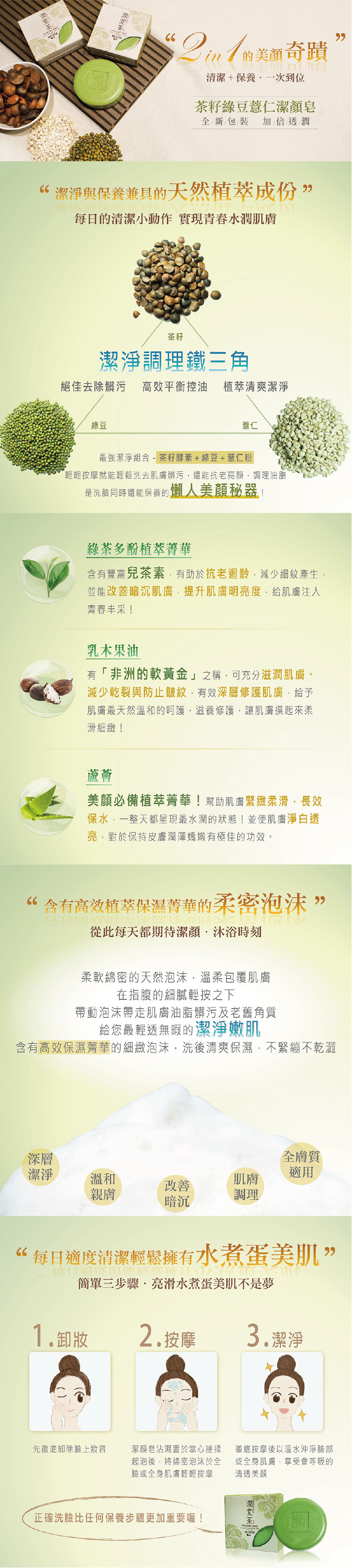 富含茶籽、綠豆、薏仁及綠茶多酚,溫和潔淨並滋潤肌膚,搭配乳木果油與蘆薈改善暗沉,散發清新綠茶香,適用各種膚質。