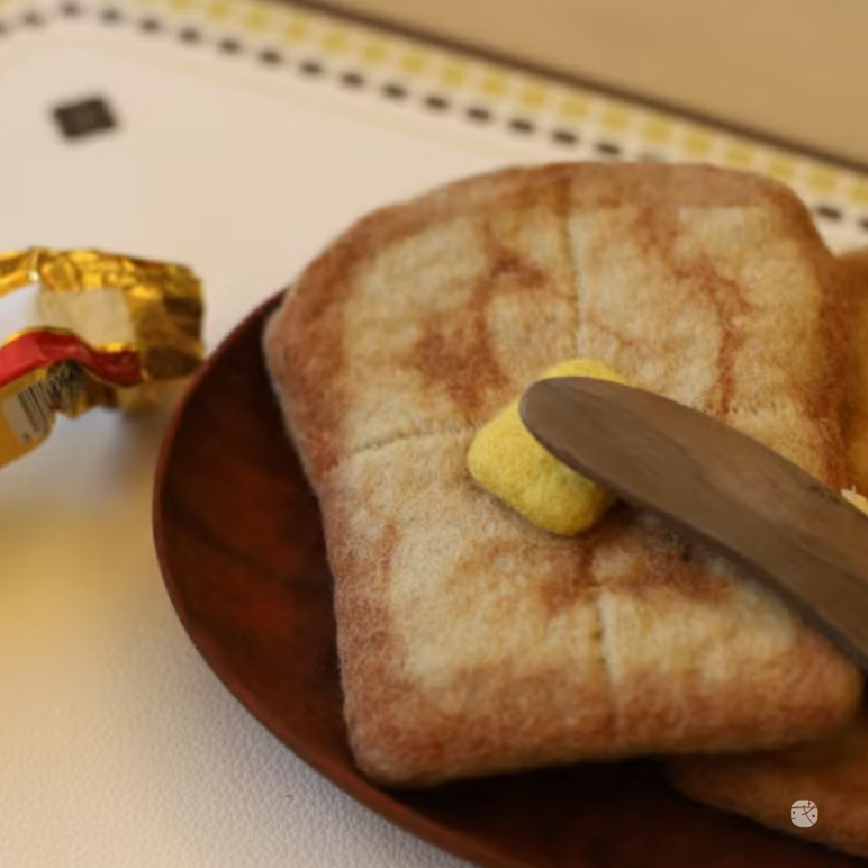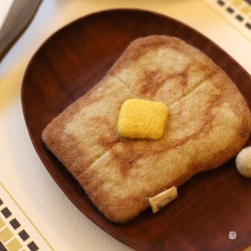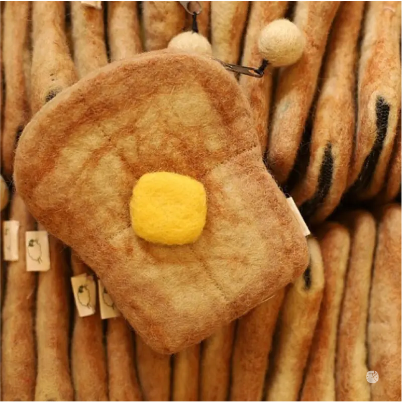 手工羊毛氈零錢包,仿照煎得恰好的法式吐司,搭配厚厚奶油的美味模樣,可愛又療癒,讓人看了心情大好。