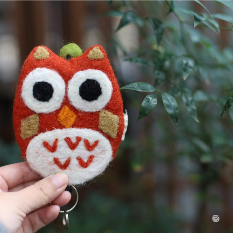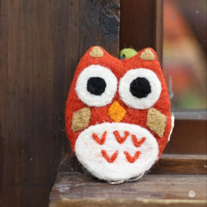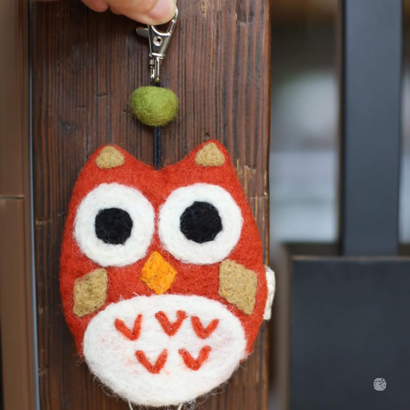 手工羊毛氈鑰匙包,可水洗、可掛包包,既可愛又實用。貓頭鷹造型象徵智慧與好運,不只保護鑰匙,也為你帶來吉祥。