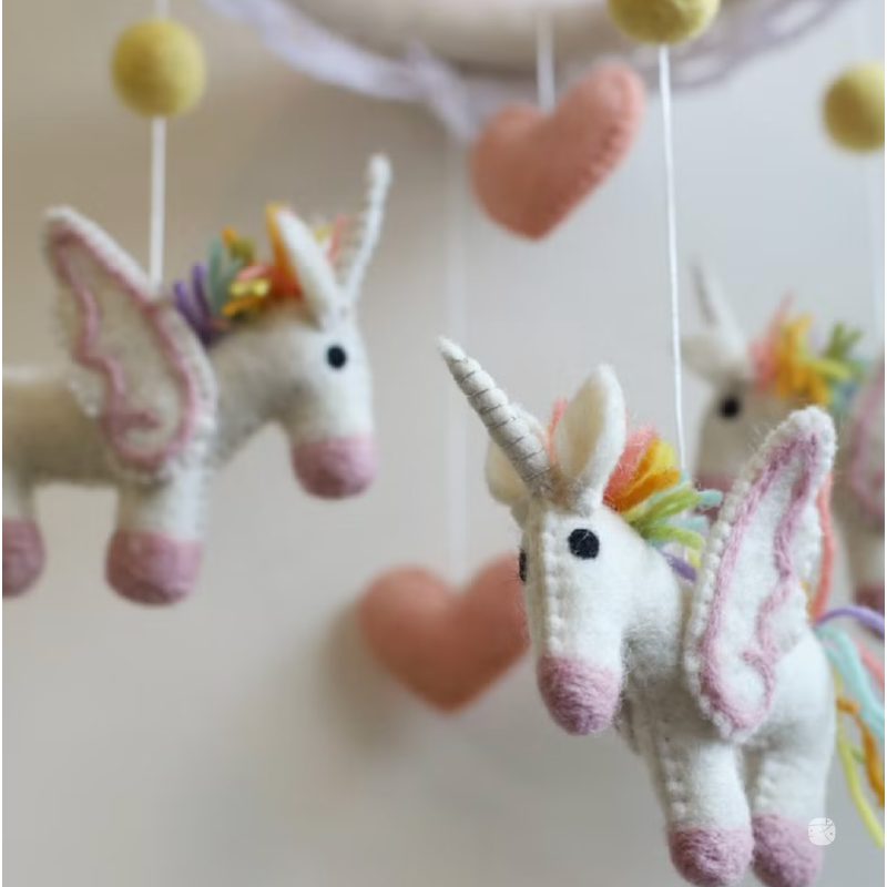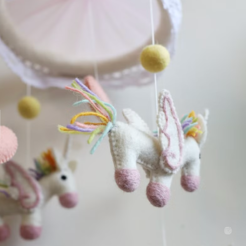 迎接寶寶降臨!羊毛氈嬰兒吊飾搭配三隻彩虹小馬玩偶、柔軟蕾絲與愛心配件,溫暖夢幻。