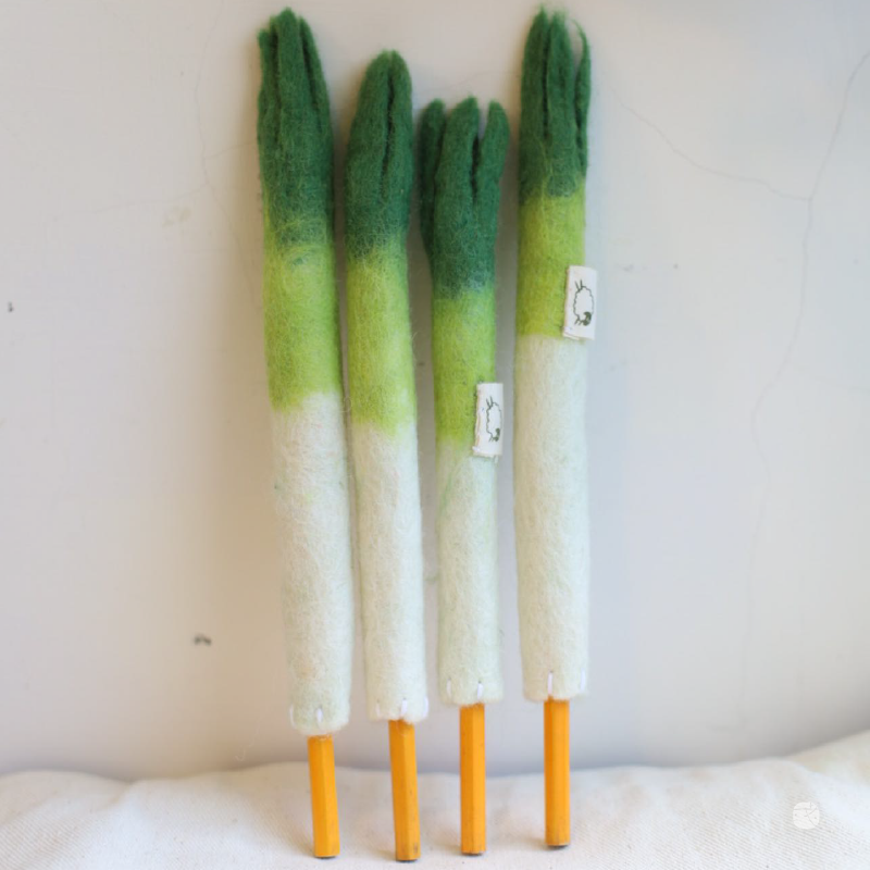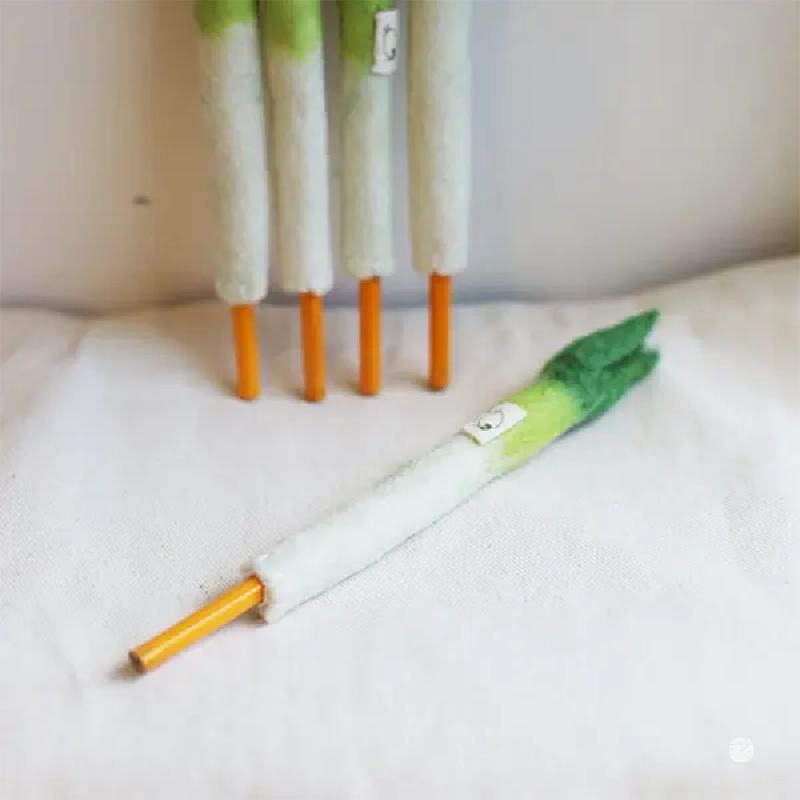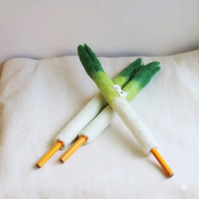 大蔥筆套,手工羊毛氈製作,綠白相間栩栩如生,附鉛筆象徵知識與好運。實用又可愛,為學習與考試增添祝福與加油氣息。