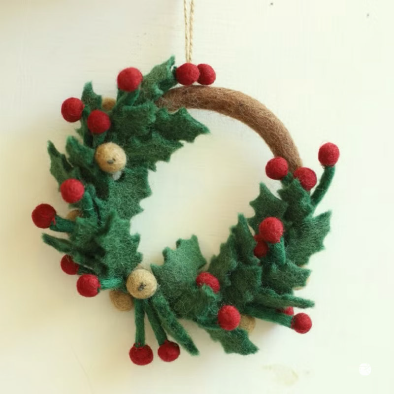 手工羊毛氈花圈,以綠葉與紅果做成迷你尺寸,放在桌上或書架都很剛好。體積小但氛圍滿滿,能悄悄點亮空間,在冷冷的季節裡陪你添一點暖意與儀式感。
