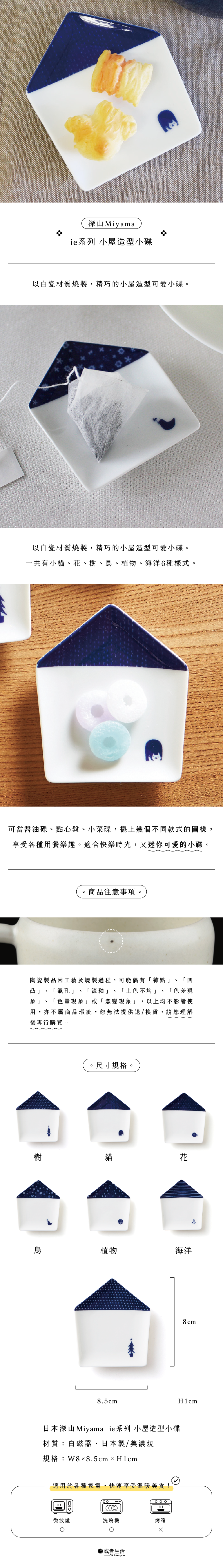 以白瓷材質燒製,精巧的小屋造型可愛小碟。一共有小貓、花、樹、鳥、植物、海洋6種樣式。