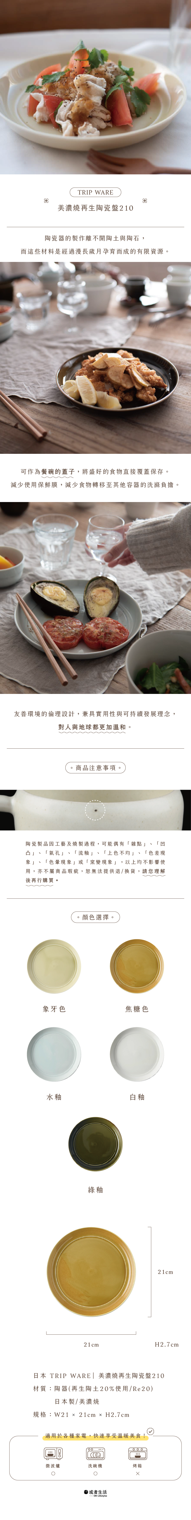 這款陶瓷盤適用於日式與西式料理,邊緣微微上翹,因此也很適合作為咖哩盤使用。當食物擺放於盤子上時,可直接倒扣一個碗於上方,讓食物維持原狀保存,既方便又美觀!