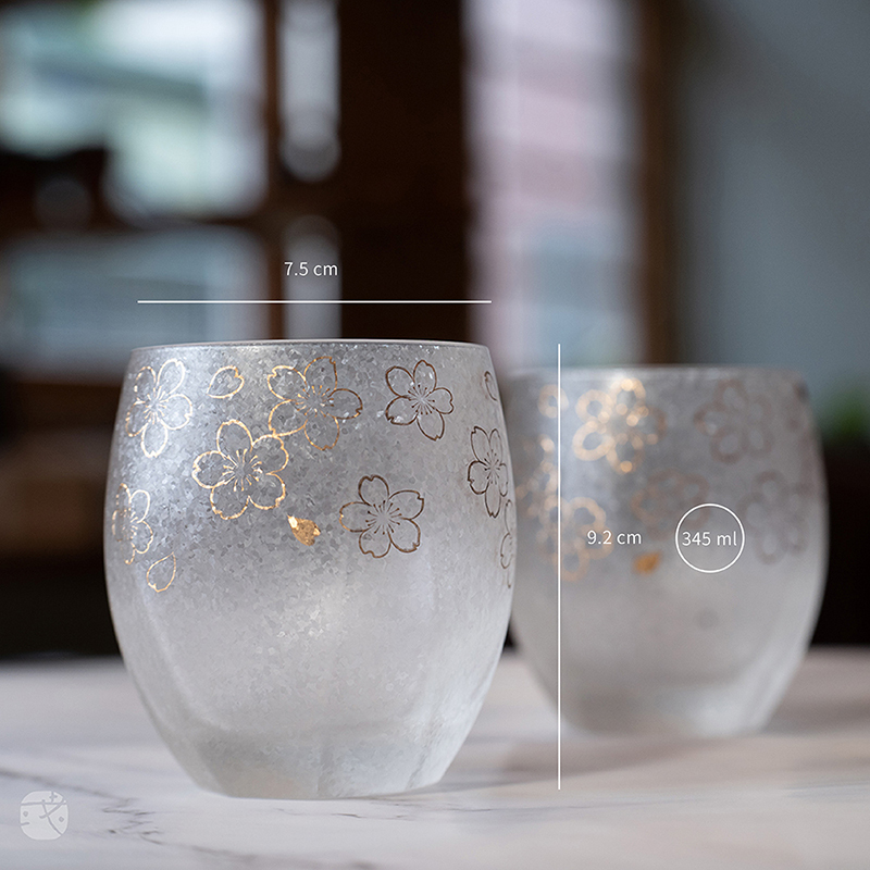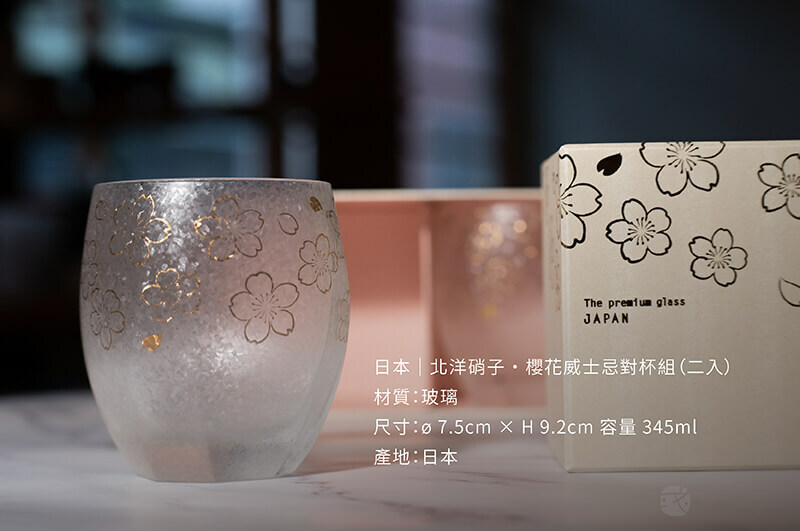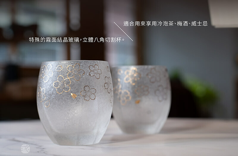 精選日本《北洋硝子》品牌,具討喜的金色櫻花圖樣,特殊的霧面結晶玻璃,立體八角切割杯身,適合用來享用冷泡茶、梅酒、威士忌。